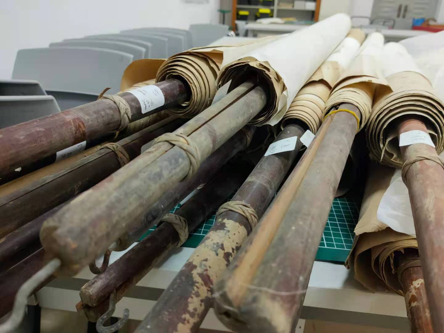 尘封于翔安校区库房多年的旧纸卷,被几层胶带和发黄的塑料纸将将包裹。而在思明校区图书馆的文献保护与修复工作室里,这些包裹被小心褪去,露出被氧化和腐蚀的纸张,边缘处甚至还有略微虫蛀的痕迹,就连固定挂画的木架也因为岁月而不再光滑。